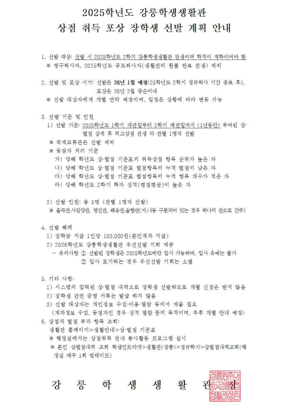 2025학년도 강릉학생생활관 상점 취득 포상 장학생 선발 계획 안내